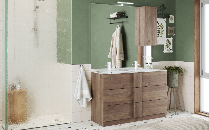 Absolument. Nos meubles utilisent des matériaux hydrofuges : bois traités, stratifiés étanches et ferrures inoxydables. Ces spécifications techniques assurent une résistance optimale à l'humidité pour un usage quotidien durable.